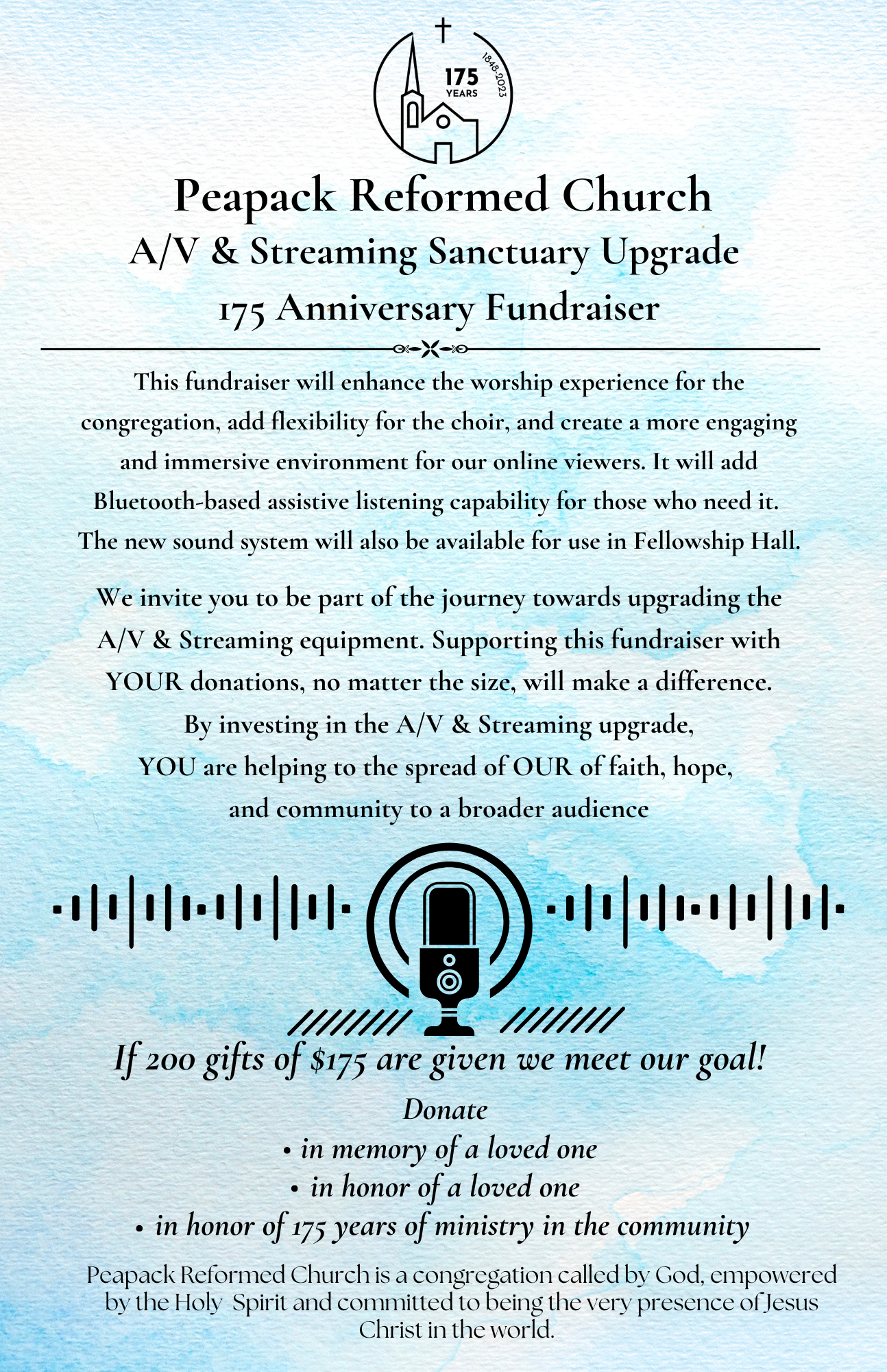 Worship is the heartbeat of Peapack Reformed Church. We are a gathered and scattered people. We gather to be fed through vibrant preaching, singing beautiful hymns and songs, celebrating of the Sacraments, and coming together as a church family. Each week we gather, only to be scattered as Christ’s body in the world. When we leave the sanctuary doors on a Sunday morning, we commit ourselves to being the salt and light our world so desperately needs. Whether you are exploring faith or are looking for a church home, you have a place in our pews.